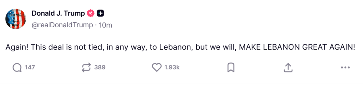 أكد الرئيس الأميركي دونالد ترامب في تدوينة له على موقع تروث سوشيال أنه "مرة أخرى! هذه الصفقة ( أي اتفاق وقف إطلاق النار بين أميركا وإيران) لا ترتبط بأي شكل من الأشكال بلبنان، وأضاف "لكننا سنجعل لبنان عظيماً مرة أخرى!"