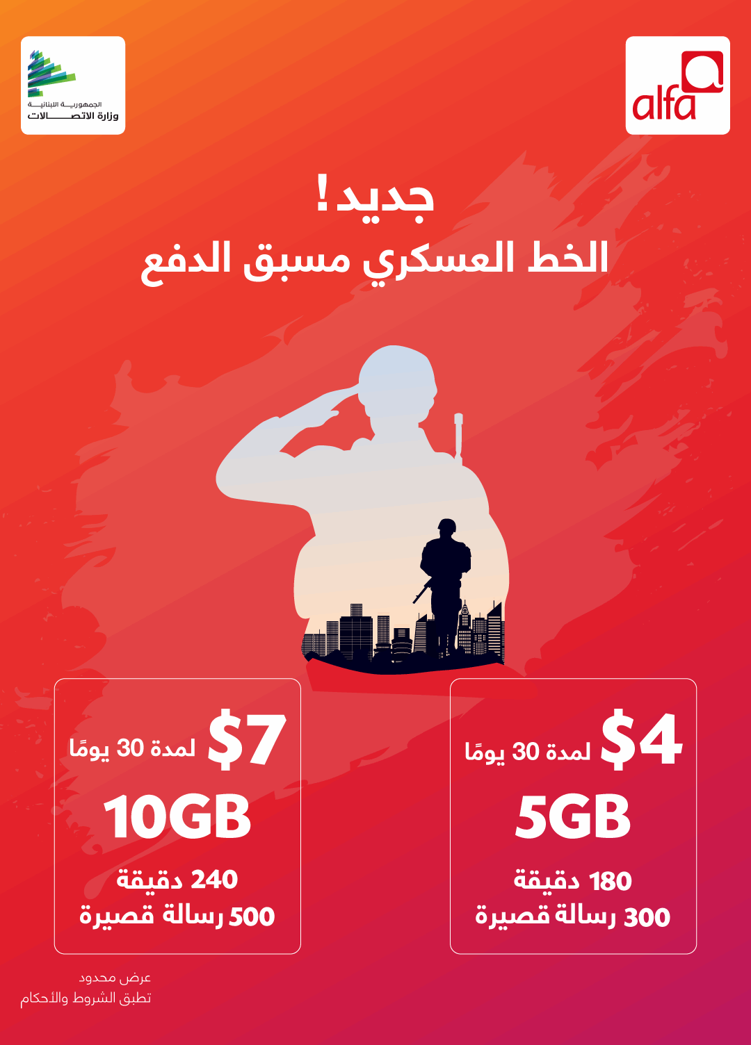 - برنامج الخط العسكري المسبق الدفع بـ 7 دولارات شهرياً يتضمن: 10GB، و240 دقيقة تخابر، و500 رسالة قصيرة.