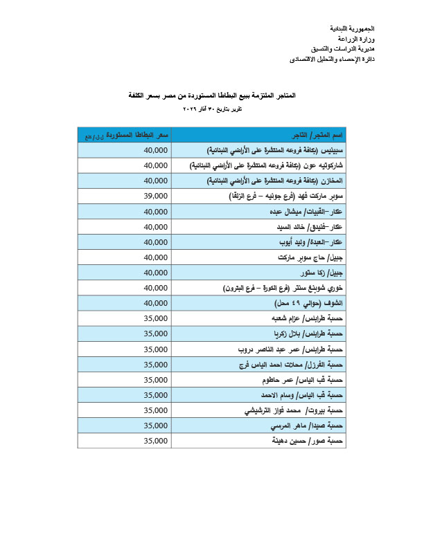 أما لائحة المتاجر ونقاط البيع الملتزمة ببيع البطاطا بالسعر المخفّض، فهي كالآتي: