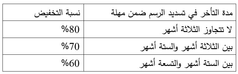 وحيث إن القرار رقم 401/2 تاريخ 07/04/2026 حدّد نسب التخفيض وفقاً لمدة التأخر في تسديد الرسم المتوجب، وذلك كما يلي: