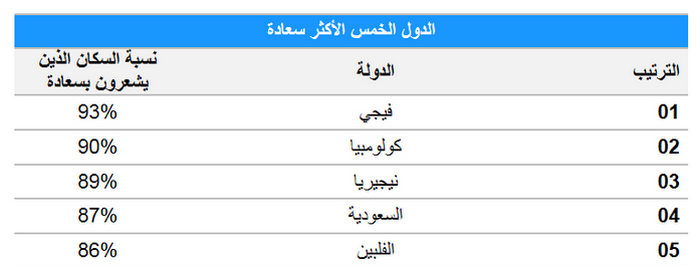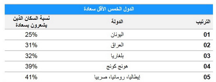 أما بالنسبة لقائمة الدول التي تشكل شعوبها التي تشعر بالسعادة نسبة قليلة جدا، فقد جاءت اليونان في المقدمة ، حيث يشعر 25 في المئة فقط من سكانها بالسعادة.