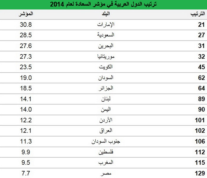 اما بالنسبة للدول العربية فقد احتلت الإمارات المرتبة 21 عالمياً، تلتها السعودية في المركز الـ27 عالميا، في حين احتل لبنان المركز الـ 89 عالميا وسبقته سبع دول عربية بينما سبق بدوره سبع شعوب عربية. وتمحورت الأسئلة التي تم طرحها في المقابلات حول مدى شعور المستطلع آراؤهم بوجود هدف لهم في الحياة، ومستوى الرفاهية المالية التي يعيشونها وحالتهم الصحية. وفيما يلي ترتيب الدول في مؤشر السعادة لعام 2014 بحسب مؤشر غالوب-هيلثويز.