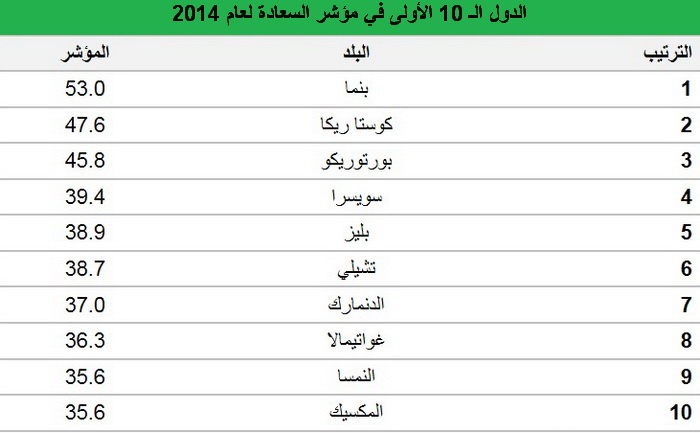حلّت بنما في المرتبة الاولى في مؤشر السعادة السنوي لعام 2014، بحسب نتائج مؤشر غالوب-هيلثويز الدولي للسعادة. وجاءت كوستا ريكا في المركز الثاني، ثم بورتوريكو في المرتبة الثالثة و سويسرا في المركز الرابع.