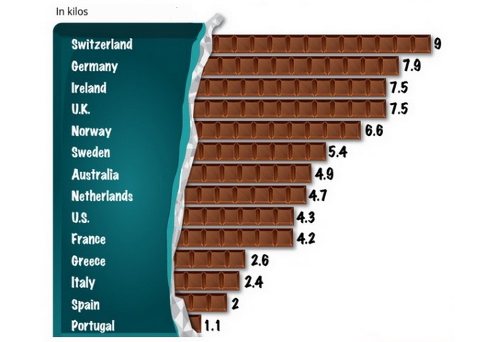 أصدرت مؤسسة "يورومونيتور" الدولية للأبحاث تقريرا، حول الشعوب الأكثر استهلاكا للشوكولاته على مستوى العالم، تصدرت سويسرا قائمة الدول الأكثر استهلاكا للشوكولاته حول العالم خلال عام 2014، حيث بلغ متوسط استهلاك الفرد نحو 9 كيلوغرامات، وجاء الألمان في المرتبة الثانية بـ 7.9 كيلوغرام.