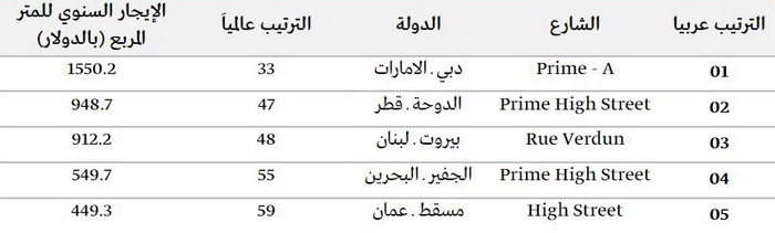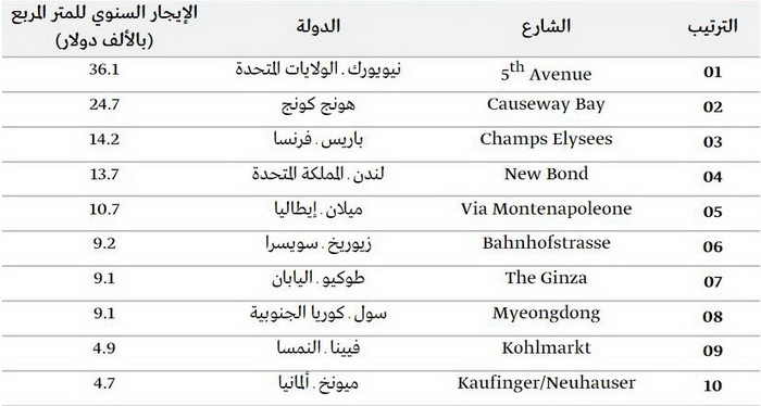 وتصدرت الجادة الخامسة في "نيويورك" قائمة الشوارع الأغلى للعام الثاني على التوالي، وجاء شارع "كوزواي باي" في هونج كونج في المركز الثاني. وحلّ شارع "فردان" في لبنان في المرتبة الـ 48 عالميا كأغلى الشوارع التجارية في العالم والثالث عربيا.