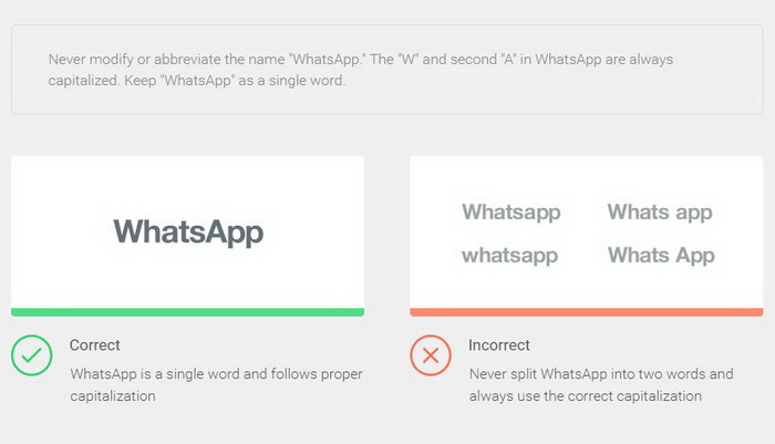 ثانياً ترفض ادارة التطبيق القيام بتعديل أو اختصار اسم WhatsApp، فهي تشدد على كتابة اسم التطبيق بطريقة متصلة أي كلمة واحدة وعلى ان يتم كتابة حرف "W" في الجزء الاول من الاسم بحرف كبير و كتابة حرف "A" في الجزء الثاني من الاسم ايضا بحرف كبير.