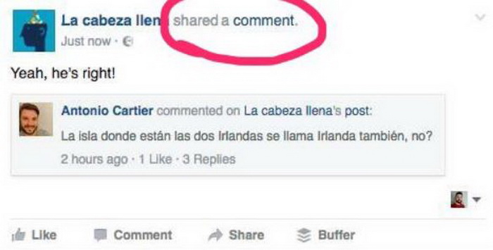 وتم رصد هذه الميزة الجديدة من قبل موقع THE NEXT WEB الهولندي، الذى قال إن هناك زر share جديد سيظهر بجانب زر الـ like وزر الـ reply في كل تعليق، حيث أنه وبمجرد الضغط على الزر الجديد فإن ذلك يعني ظهور الـ comment الذي اختاره المستخدم على صفحته الخاصة.