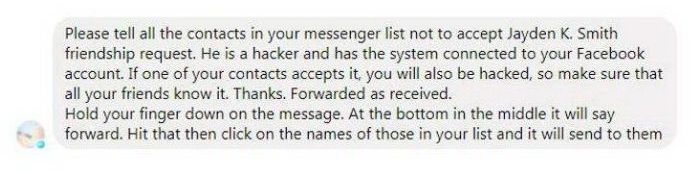 وتنص الرسالة على رفض طلب الصداقة من شخص يُدعى Jayden K. Smith "جايدن ك سميث"، على إعتبار أنه "هاكر" يريد اختراق الحسابات ويسرق البيانات الشخصية للمستخدم ويهدده، كما تطلب الرسالة من المستخدم الذي يتلقاها ان يقوم بنشرها بين الاصدقاء.