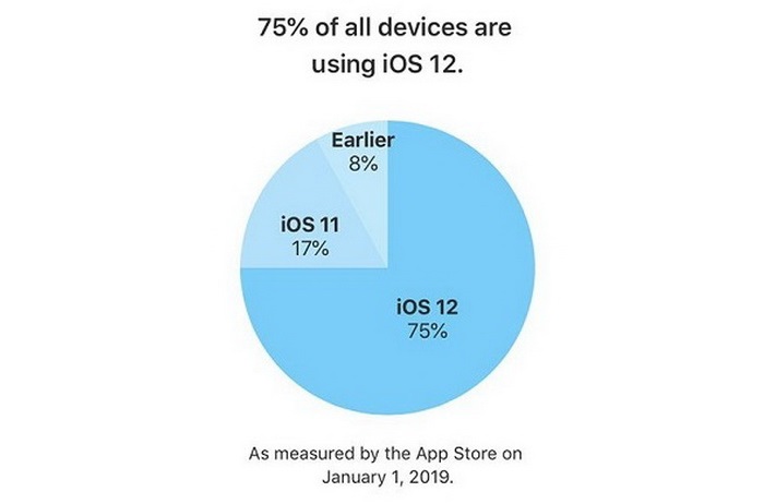 ووفقاً لآبل فإن 75 في المئة من حاملي هواتف آيفون وأجهزة آيباد يستخدمون نظام iOS 12 وذلك حتى تاريخ 1 كانون الثاني يناير 2019.