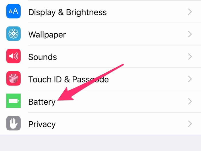 1- التوجه إلى خيار Battery في قائمة الإعدادات اي Settings