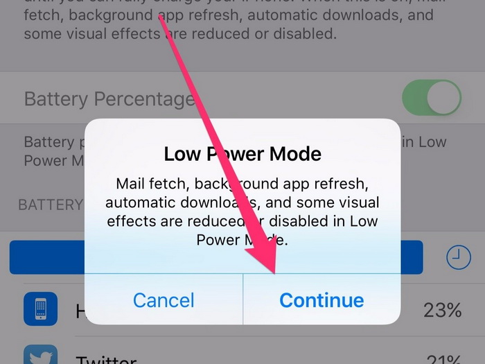 2- النقر على خيار Low Power Mode، ثم اختيار continue