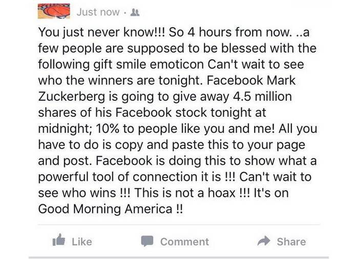 انتشرت سلسلة جديدة من المنشورات التي تستهدف النصب على مستخدمي موقع فيس بوك، بعد إعلان الرئيس التنفيذي للموقع مارك زوكبيرغ، منذ عدة أسابيع عن التبرع بنحو 99 في المئة من أسهمه، حيث تخدع هذه الرسائل المستخدمين وتعدهم بالحصول على جزء من هذه التبرعات في حال مشاركة المنشور.