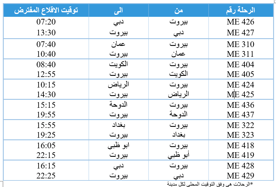 1) بالنسبة لرحلات بيروت -عمان-بيروت سيتم الغاء الرحلة الصباحية ME310/ME311 مع الابقاء على رحلة بعد الظهر ME312/ME313 وفق الجدول المعتاد.