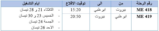 تعلن شركة طيران الشرق الأوسط – الخطوط الجوية اللبنانية عن اعادة تسيير رحلات الشركة من والى ابو ظبي بواقع 4 رحلات اسبوعياً اعتباراً من الثلاثاء 21 نيسان 2026 ولغاية الخميس 30 نيسان وفقاً للجدول المبين غي الصورة أدناه: