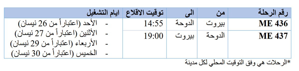 تعلن شركة طيران الشرق الأوسط – الخطوط الجوية اللبنانية، عن إعادة تسيير رحلاتها من وإلى الدوحة اعتباراً من يوم الأحد 26 نيسان 2026، بواقع 4 رحلات أسبوعياً.
