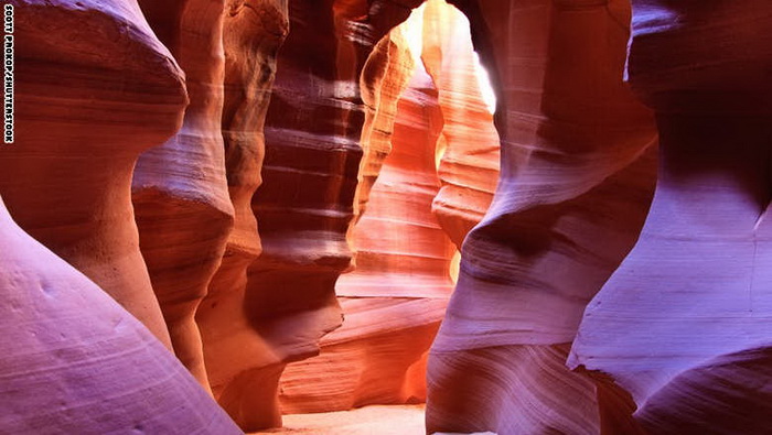 10- أميركا :بعض المناطق تحظى باختلاف ألوانها بسبب تنوع الضوء الذي تتلقاه، مثل وادي أنتيلوب في ولاية أريزونا الأميركية، الذي تشكل بسبب عبور مجار للمياه خلال تشققاته، ويمكن التوجه لزيارته في فترة الصيف، حيث تمنح أشعة الشمس الصخور ألواناً مذهلة.