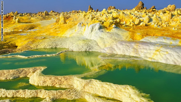 1 - أثيوبيا: تعتبر مياه داللول المالحة والحارة إحدى أكثر الينابيع انخفاضاً، حيث تمزج ترسبات الكبريت الصفراء لونا مميزا مع الأملاح البيضاء.