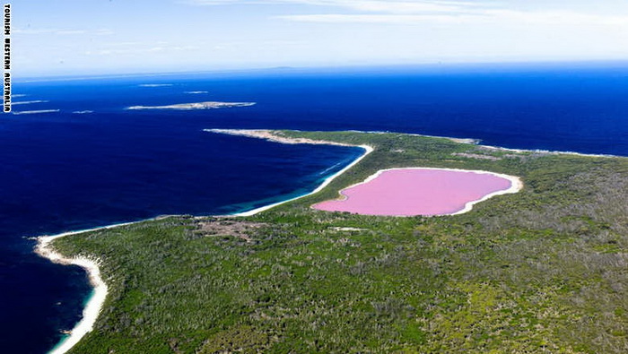 2- أستراليا: تمتد بحيرة هيلير وقطرها 2000 قدم وسط جزيرة ميدل. وبالرغم من أن سبب اللون الغريب للبحيرة لا يزال مجهولا، إلا أن بعض العلماء فسروه بارتفاع نسبة الأملاح فيه، أو بسبب بكتيريا تنتج صبغة ملونة في مياهها.