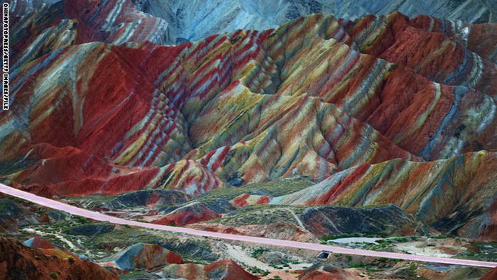 4- الصين: مجموعة متنوعة من خطوط الألوان تمتد عبر سفوح جبال زانغيي الصينية، والألوان ناجمة عن ترسبات للمعادن في الصخور الرملية التي نشأت منها الجبال قبل ملايين السنوات.