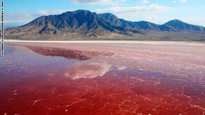 9- تنزانيا: تمتاز مياه بحيرة ناترون بحرارة وملوحة شديدتين تبعد عنها أي شكل من الحياة، إلا أن هنالك أنواعاً قليلة من الطيور مثل الفلامنغو وغيرها ممن يعتبر من محبي هذه البحيرة، الى جانب نوع من الطحالب والأحياء المجهرية التي تحب المياه لتمنحها لوناً أحمر داميا.