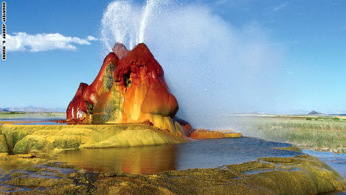 15- أميركا: نوافير فلاي الحارة وهي ملكية خاصة، يمنح أصحابها جولات للزوار في بعض الأحيان، ويمكن رؤيتها من على الطريق الرئيسي. ظهرت هذه التشكيلة بعد أن قام شخص بإحداث ثقب في الأرض لتتدفق منها المياه الحارة وتنتج هذه النافورة بشكلها الغريب بعد فترة من الزمن.