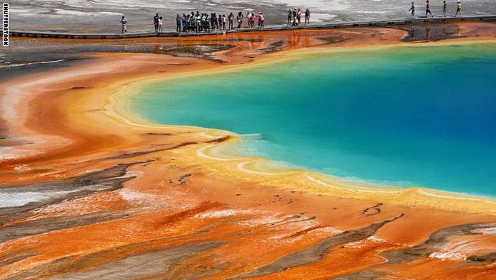 6- أميركا: يقع نبع غراند بريسماتيغ في حديقة يلوستون الوطنية في ولاية وايومينغ ويمتد على طول 90 متر ويبلغ عمقه 50 متر، ولا يمكن لمياهه أن تحوي أي علامة للحياة بسبب شدة سخونتها، إلا أن البكتيريا والطحالب تنمو على ضفاف الينبوع لتنتج فضلات باللونين البرتقالي والأصفر ليكون الناتج ما ترونه بالصورة.